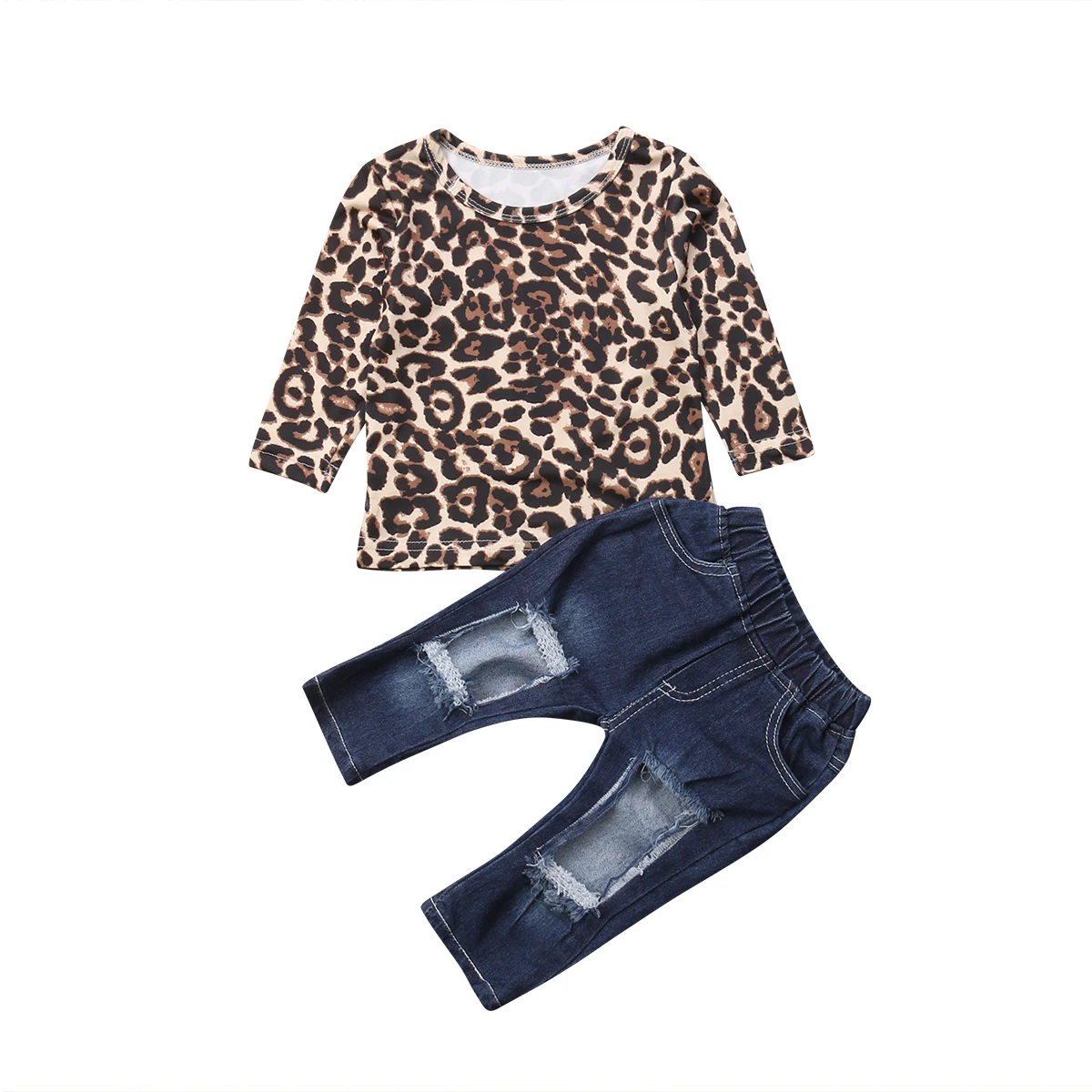 Good Offer of Toddler Baby Girl Leopard Long Sleeve Tops Shirt Ripped Denim Destroyed Jeans Pants Kids Clothes Ou